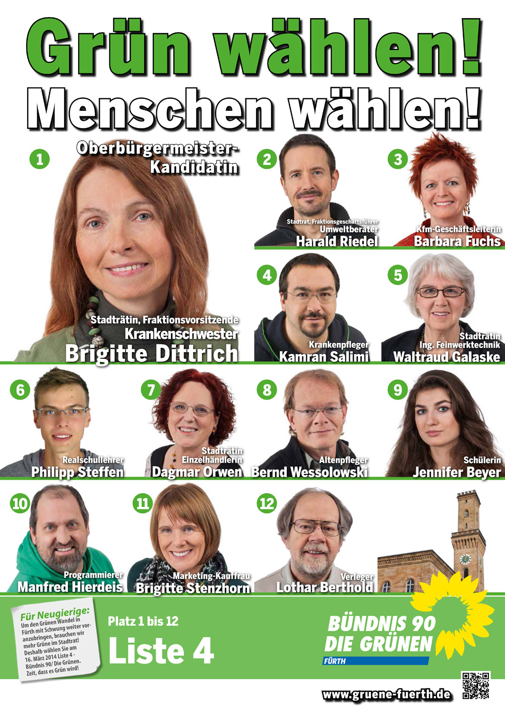 Seit knapp 30 Jahren treten die Grünen in Fürth zur Kommunalwahl an. Vieles konnte in dieser Zeit durch uns bzw. mit unserer Hilfe umgesetzt werden. Am 16. März 2014 treten die Grünen erneut zur Kommunalwahlen an – als echte Alternative mit einem umfassenden Programm und einer starken Liste, die die Viefalt unserer Stadt wiederspiegelt.